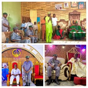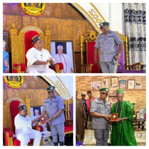 On Tuesday, 1 April 2026, the Acting Customs Area Controller, Oyo/Osun Area Command, DC Wale Moses Adewole, paid a familiarisation visit to the palaces of the Onigbeti of Igbeti, the Iba of Kishi, and the Okere of Saki in Oyo State, as part of efforts to strengthen collaboration with traditional institutions in the Command’s area of responsibility.